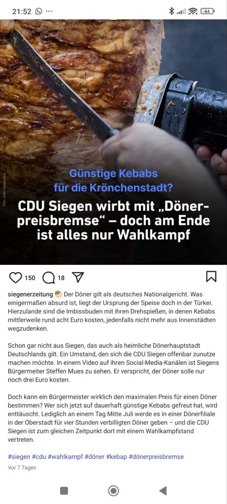 Na bravo! Die CDU Siegen hat den Wahlkampf endgültig zur Realsatire gemacht. Statt sozialer Lösungen gibt’s jetzt Fleisch vom Spieß – und zwar für vier Stunden. Vier Stunden lang günstiger Döner – das ist der ganze Plan? Ernsthaft?